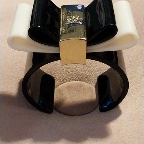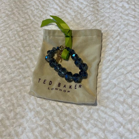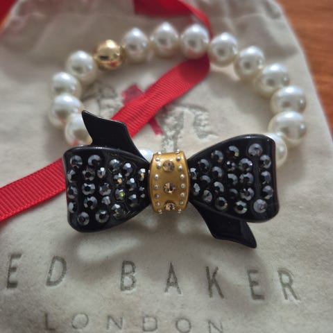 Ted Baker nahka rusetti rannekoru. Rusettissa teksti Ted Baker. Nahassa hieman jälkiä. 3 koko reikää. Koko pituus 19,5 cm. Rannekorun pussi.