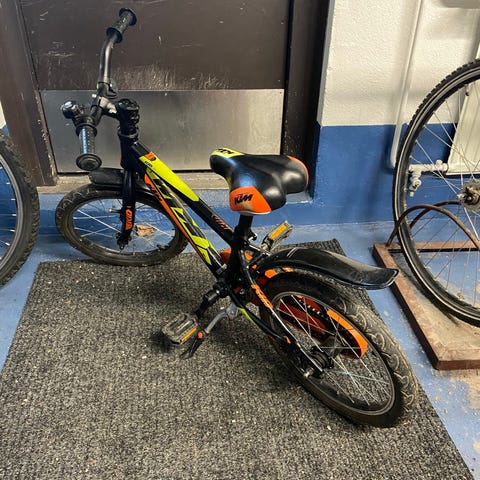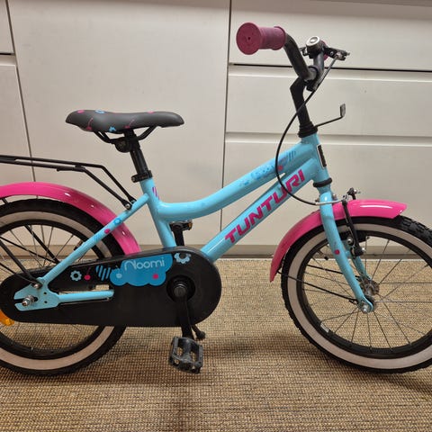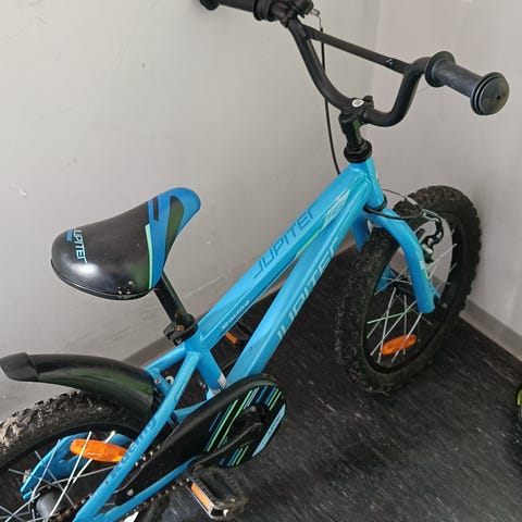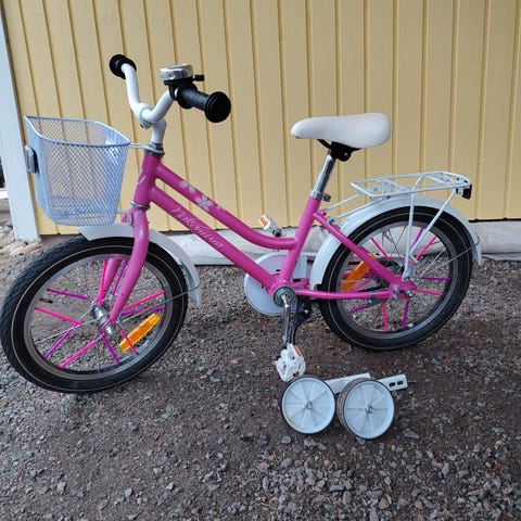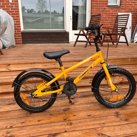 White Lasten polkupyörä, koko 16 tuumaa, musta runko oranssilla yksityiskohdilla. Pyörä on erittäin hyvässä kunnossa, sitä on säilytetty sisällä. On ehkä tullut käytettyä 10-20 kertaa.