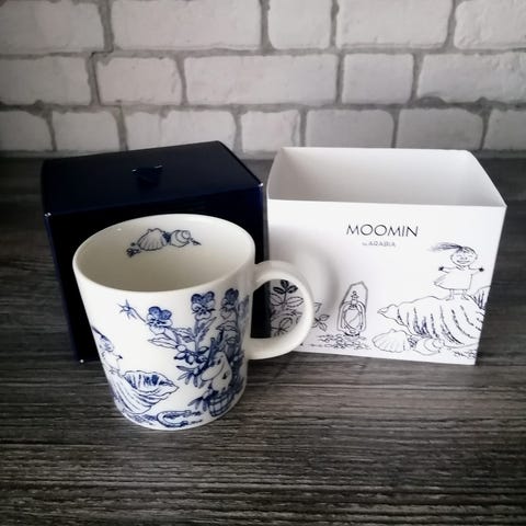Uusi, tarrallinen muumimuki säilytyslaatikolla. Arabian 150 v juhlavuoden muki (2023).