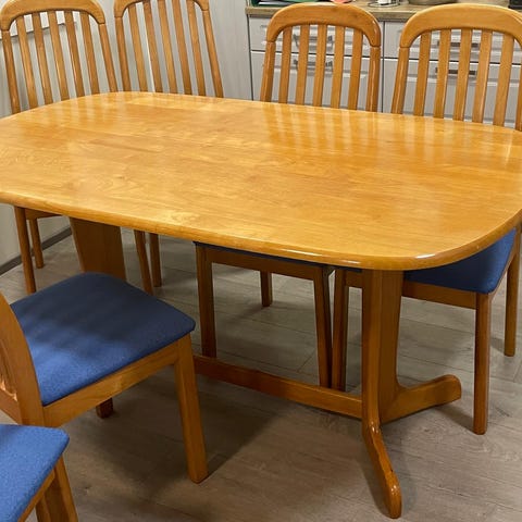 Ruokailuryhmä pöytä ja 4 mustaa tuolia puu ja metalli