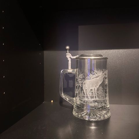 Lasinen tyylikäs oluttuoppi. Korkeus n. 18,5 cm, halkaisija n. 8 cm, tilavuus 0,9 l. Kunto moitteeton.