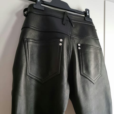 Mustat, todella mukavat ja tyylikkäät farkkumalliset nahkahousut. Erittäin pehmeä ja miellyttävän tuntuinen huippulaadukas lampaannappa. Nahka on hieman ohuempaa, ei siis ole prätkähousut kyseessä.