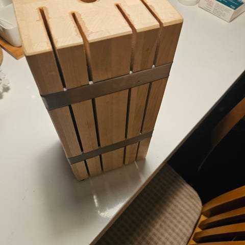 Myydään valkoinen veitsiteline, jossa on mustat jouhet. Harjakset suojaavat veistä ja ne voi irroittaa puhdistamista varten. Tähän mahtuu monta veistä. Korkeus 22 cm, halkaisija 11 cm.