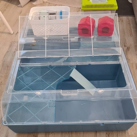 Ferplast häkkitarvikesetti hamsterille sisältäen häkin, juoksupyörän, juomapullon, ruokakupit, pesäkopin ja puisen rampin ja muovisen rampin. Häkin pohja on muovia ja häkin yläosa metallia. Ollut syyrialaisella hamsterilla käytössä. Rampin toinen kiinnike rikki ja häkin pohjalla pissatahroja joita en ole koittanut hinkata, voi lähteä jollain pois. Muuten ehjä ja hyvässä kunnossa. Tarkempi pesu jää ostajalle. Vain nouto Hakunilasta.