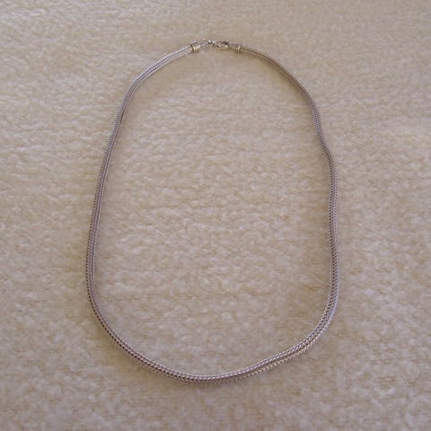 Myyn hopeisen Kalevala korun verkkoketjun, pituus 44,5 cm. Leimat kk ja 925. Paino 16 g.