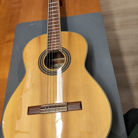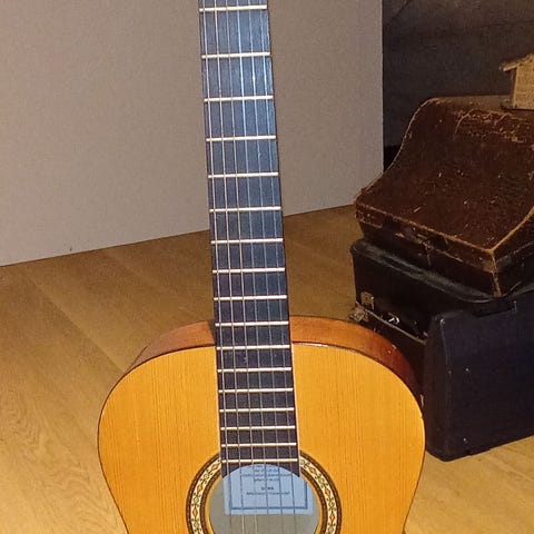 Espanjalainen 3/4-kokoinen klassinen nailonkielinen laatukitara, tarkka malli 1492/61. Suoraan soitosta, kieletkin vielä hyvät. Käytön jälkiä siellä täällä, mutta yleisilme siisti, kuten kuvista näkyy. Uutena lienee yli 500 euron soitin ja uudenveroisista käytetyistäkin pyydetään maailmalla satoja euroja. Mukaan hyvä kuljetus- ja säilytyspussi.