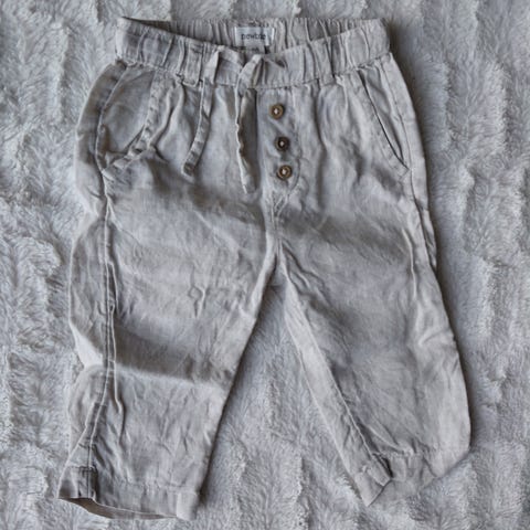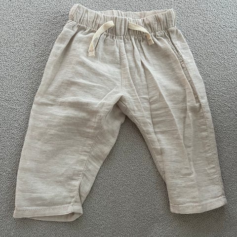 Myydään hyväkuntoiset beiget pellavahousut koossa 68. Nämä olleet käytössä vain pari kertaa juhlissa.