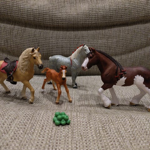 Tämä setti on alunperin tullut Schleich Horse Clubin joulukalenterista vuonna 2016, eli esimerkiksi hevosia ei enää valmisteta enää. Ylipäätään kaikki hyvässä kunnossa. Valkoisessa hevosessa pieniä käytönjälkiä kyljissä, jotka näkyvät kuvissa. Hieman pientä kulumaa myös hahmossa. Muuten kaikki tarvikkeet ovat todella hyvässä kunnossa ja vähän leikittyjä.