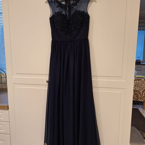 Erittäin hyväkuntoinen mekko, jolla tanssittu yhdet tanssit. Olen itse 167 cm pitkä ja tanssin matalapohjaisilla tennareilla. Mekkoa on kavennettu hieman takaa, mutta ompeleet saa purettua. Mekossa on myös halkio, jota on ommeltu yhteen parista kohdasta, mutta nekin on helppo purkaa. Nyörien ansiosta mekon koko on säädettävissä. Ostettu Iltapuku Outletista. Mekko on pesty ja sitä saa tulla sovittamaan.