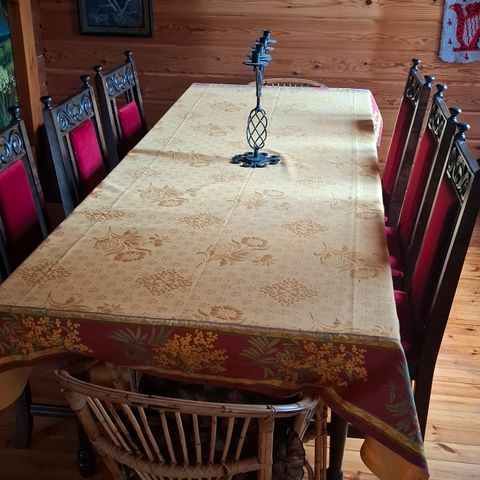 Tummasta valkoiseksi maalattu. Täyttä puuta. Tyyli vanhahkoa. Tukeva. Pöydässä oleva halkeama elää aina huoneen ilmankosteuden mukaisesti. Tuo vain rustiikkisuutta. Jalat saa irti. Mukana 6 tuolia.