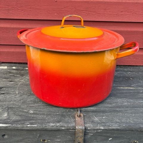 Emalikattila koristeeksi. Halkaisija n. 25 cm, korkeus 16,5 cm, tilavuus 7 litraa.