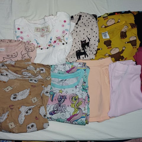 Suurin osa kokoa 116 tai vastaa sitä, mutta mukana myös muutamia isompia vaatteita.