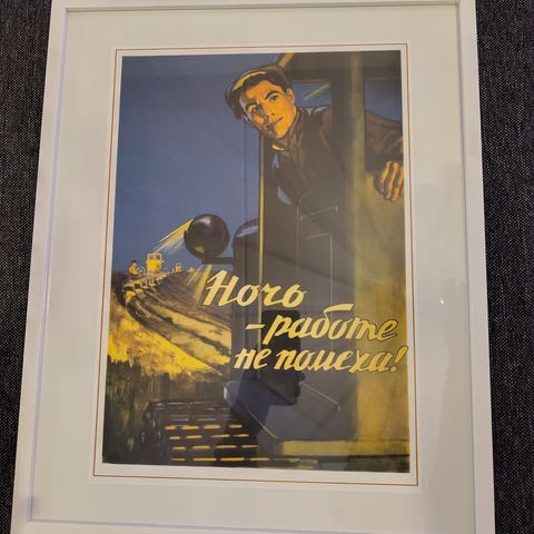 Paperinen propaganda posteri kehyksissä. Posteri on sinitarralla kiinni.