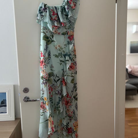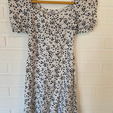 Ihana Modströmin mekko, jossa keltaisia kukkia. Vetoketju sivussa ja nappi niskassa. Koko XS. Midimittainen.
