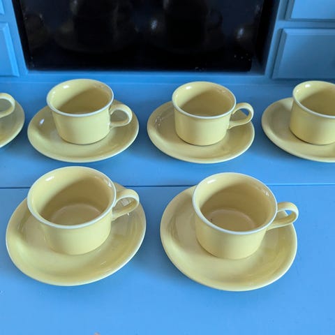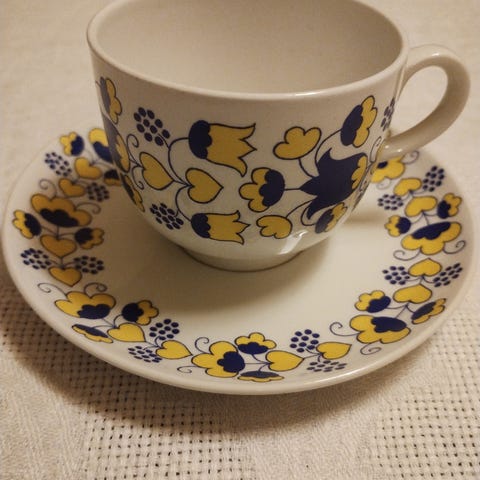 Arabia Wärtsilä TV-setti - kahvikuppi ja lautanen. Kunto hyvä, ainut jälki on kahvikupissa ks kuvat. Sarja sisältää kahvikupin ja lautasen, joissa on sininen koristekuviointi. Valmistusvuosi 1961.