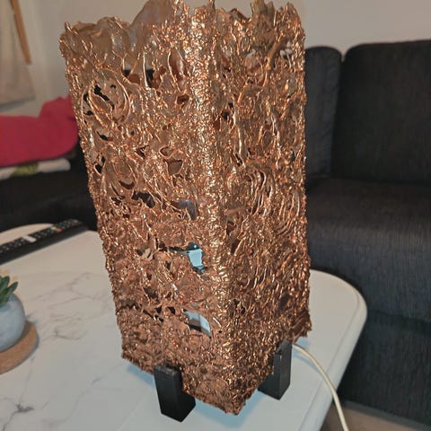 Mitat (LxKxS) ovat kokonaisuudessaan noin 12,0 x 63,5 x 12,0 cmVarjostimen halkaisija on 34,5 cmLampun kanta on E27, 60 WMaadoittamaton pistoke, kytkin johdossaMateriaali: alabasteri, messinki, kangasKierrätyskeskuksen tarkistama laite.