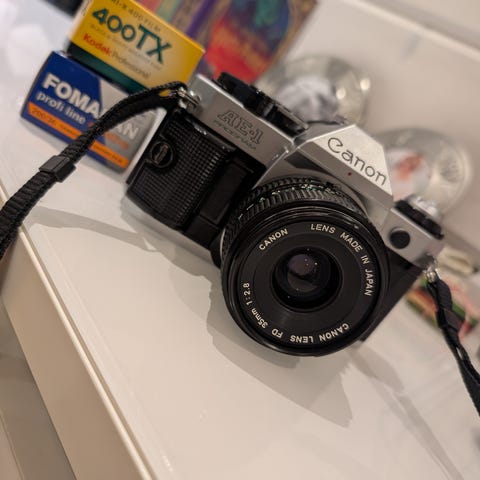 Valmistaja: CanonMalli: AE-1Väri: musta, kromiMukana:FD 50mm 1:1.8 objektiiviFD 35-70mm 1:4 objektiiviLinssinsuojatRunkotulppaKantohihnaKierrätyskeskuksen tarkistama tuote.
