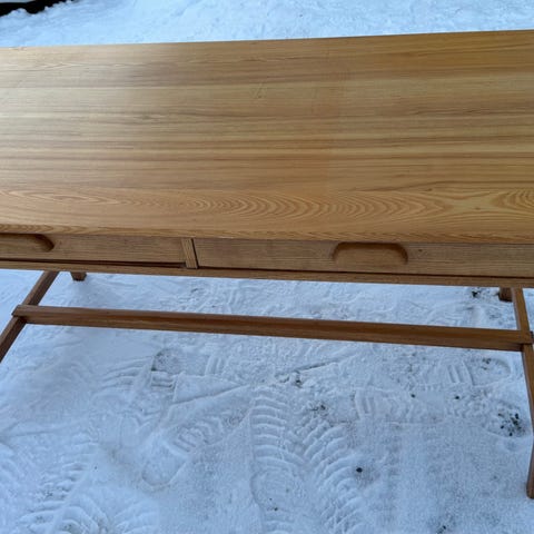 Lasinen pöytä tukevilla jaloilla. Helppo pitää puhtaana pyyhkimällä. Erittäin tukeva ja suuremmatkin projektit mahtuu työn alle. Siistikuntoinen ja kaikin puolin ehjä.