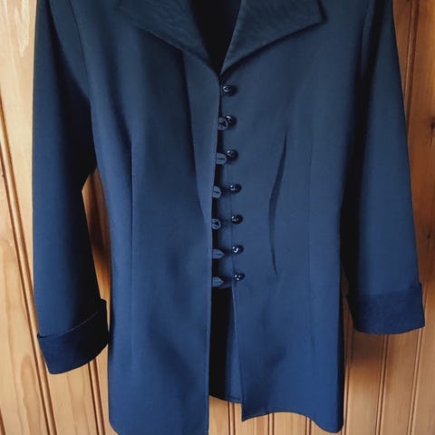 Suomessa valmistettu musta laadukas Modelia-merkkinen jakku. Jakussa on taskut ja olkatoppaukset.