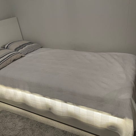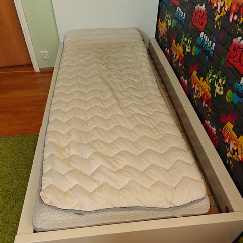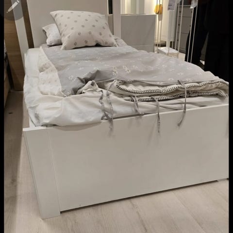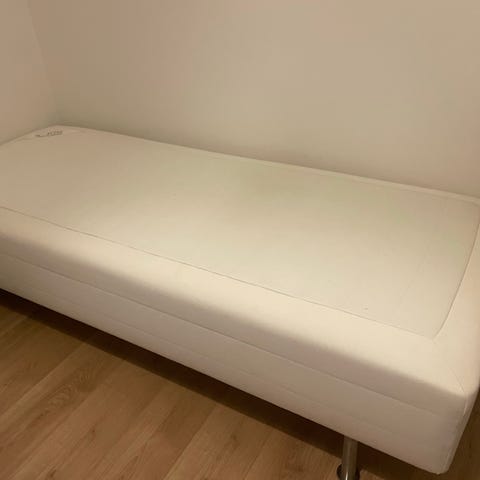 IKEA Sultan Singås sänky, jossa vaaleanharmaa verhoilu ja puiset jalat. Sänky on suunniteltu yksittäiseen käyttöön ja tarjoaa perusmukavuuden nukkumiseen.