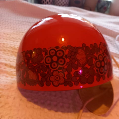 Design Kaj Franck (lamppu), Raija Uosikkinen (kuvio)Mitat (LxKxS) ovat kokonaisuudessaan noin 21,0 x 17,0 x 21,0 cmVarjostimen halkaisija on 21,0 cmLampun kanta on E27, 40W (asennettuna 60W lamppu)Maadoittamaton valaisinpistoke, pieni sokeripalaMateriaali: emali, muoviKierrätyskeskuksen tarkistama laite.