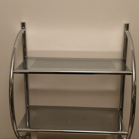 Ikean mallistoa oleva kylpyhuoneen hylly. Kannattimet kromia.
