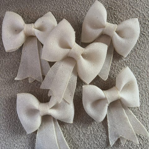 Hopeanvärinen lasinen rusetti koriste kimalteella, valkoinen samettinauha ripustus. Korkeimmillaan yläosassa n. 2,8cm/leveimmillään n. 8,9cm, syvimmillään n. 7cm. Käyttämätön.
