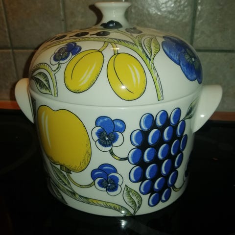 Arabia, Paratiisi Lautanen, erikoiserä v. 1968. Birger Kaipiaisen suunnitteleman Paratiisi-sarjan lautanen vanhaa tuotantoa. Valmistettu erikoiserä n. 500 kpl Arabian Espan myymälän avajaisiin vuonna 1968. Lautasen halkaisija n. 19 cm x 21 cm.