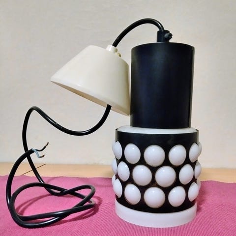 Design Stig LindströmMitat (LxKxS) ovat kokonaisuudessaan noin 20x26x20 cmVarjostimen halkaisija on 20 cmLampun kanta on E27, 60WMaadoittamaton johto valaisinpistokkeellaMateriaali: Lasi, metalli, muoviKierrätyskeskuksen tarkistama laite.