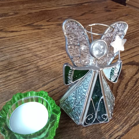 Posliininen enkeli kynttilänjalka, jossa enkeli pitää kynttilänpidikettä käsissään. Tuote soveltuu koriste-esineeksi tai kynttilänjalaksi erilaisiin tiloihin.