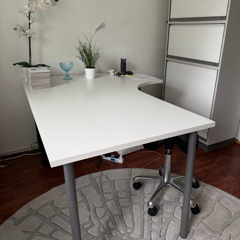 Kulmapöytä integroidulla hyllyllä ja laatikolla