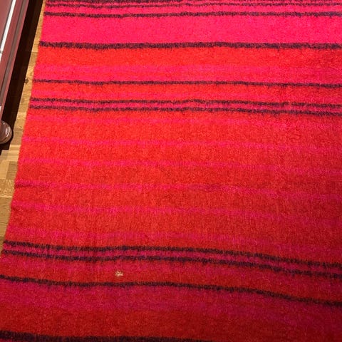 Mitat (LxP) ovat noin 130 x 180 cmMateriaali: 100% villaDesign Riitta-Maija OksanenII laatu: keskellä tahra, vähän nukkainenLaatu on otettu huomioon tuotteen hinnassa.