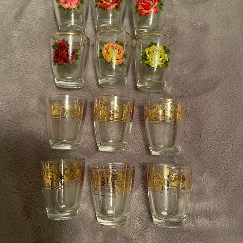 6 kpl laseja, 9 cm kork, halk 3,5cm, tilavuus n 50 ml. Lasiset, käsintehdyt rypäletertut upotettuna ulkopuolella. 25 €.