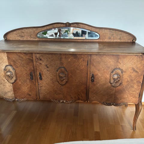 Lehtikullattu puinen senkki, kaunis ja tyylikäs.Keskiosastolla on peiliä, sivuissa hylly ja laatikot. Metalliset koristeet.