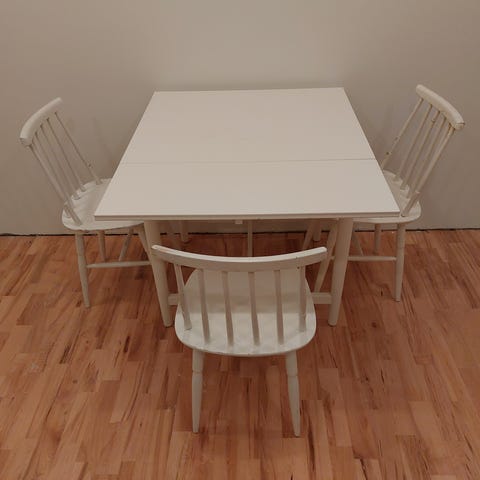 Pöytä on ehjä, tukevarakenteinen ja hyvässä käyttökunnossa. Normaalia käytön jälkeä hieman maalipinnoissa on. Ihanteellinen ratkaisu pieneen keittiöön tai ruokailutilaan! Mahtuu pieneen tilaan tarvittaessa, mutta antaa myös paljon pinta-alaa silloin, kun tilanne (tai vieraitten määrä) sitä edellyttää.