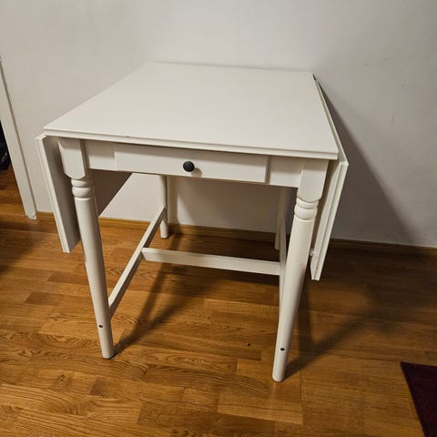 Valkoinen kahdella taittuvalla klaffijatkolla varustettu ruokapöytä uutta omistajaa vailla! Pöydän kansi valkoista kalustelevyä, alarunko ja jalat täyttä puuta. Pöydässä on lisäksi kätevä vetolaatikko toisella sivulla. Pöydän korkeus on 75 cm. Pöydän kannen koko ilman klaffiosia on 65 x 78 cm, yhden klaffiosan kanssa 94 x 78 cm ja kummankin klaffiosan kanssa 123,5 x 78 cm.