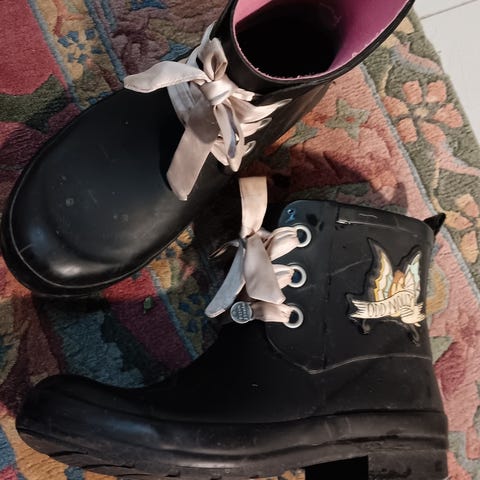 Nämä Odd Mollyn pitkävartiset kumisaappaat ovat valmistettu mustasta kumista. Niiden vartta koristaa perhosaiheinen laatta, ja varren yläreunassa takana on rusettinauhoilla varustettu nyöritys. Saappaissa on kirkkaan vaaleanpunainen tekstiilivuori.Koko 36. Lätkä kiinnitetty varteen, uudenveroinen tuote.Valmistaja: ODD MOLLYVäri: mustaMateriaali: kumi
