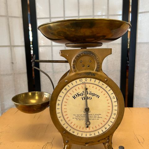 Kermanvalkoinen Arabia talousvaaka keraamisella rungolla ja tasolla. Vaakatason päällä on tunnusomainen Arabian leijonaleima. Punnitusmekanismi sisältää säädettävän punnussauvan, jossa on selkeät mitta-asteikot.Metalliosissa näkyvää ajan patinaa ja kulumaa.Valmistaja: ARABIAVuosi: 1949-1964Väri: kermanvalkoinen, tumma metalliMateriaali: posliini, metalliKoko (LxKxS): 20,0 x 11,0 x 21,0 cm