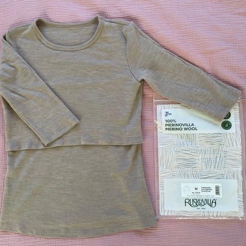 Myydään täysin käyttämätön ruskovillan imetyspaita, joka on 100% merinovillaa. (Rypyt tulleet pakkauksessa). 3/4 pituiset hihat. Koko XL.