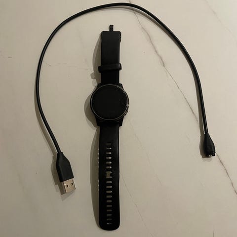 Garmin Vivoactive 4 älykello mustalla rannekkeella. Sisältää latauskaapelin. Sopii päivittäiseen käyttöön ja urheiluun.