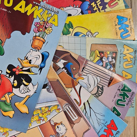 Myydään n. 90 kpl 20-luvun Aku Ankkoja, useimmat vuosilta 2022-2024. V. 2021 lopulta 6 kpl (sis. joulunumerot), 2022 26 kpl, 2023 30 kpl (joulunumerot mukana), 2024 28 kpl. Lisäksi vuosilta 2013 ja 2015 1 kpl kumpaakin. Miel. nouto.