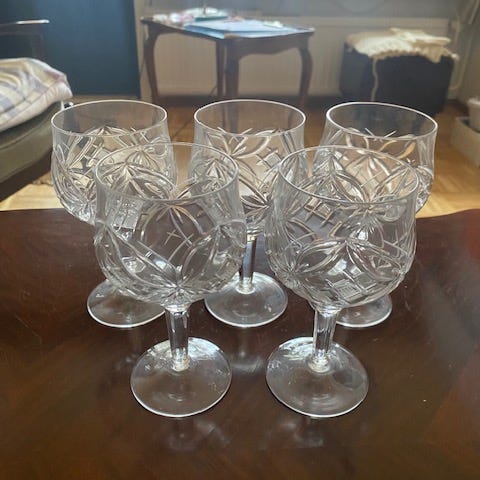 2 x lasi, mitat (HxK) ovat noin 9,5 x 10,5-11,5 cm2 x kulho, mitat (HxK) ovat noin 13,5 x 7,5 cm2 x lautanen, halkaisija on noin 20 cm1 x tarjoilukulho, 17,5 x 10,5 cmMateriaali: lasiDesign Ulrica Hydman-Vallien