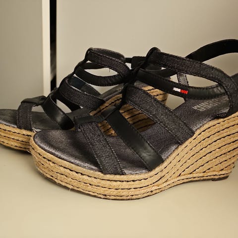 Nämä Tommy Hilfiger -sandaalit erottuvat tukevalla, paksulla korolla, jonka ulkopintaa koristaa neliönmuotoinen, kohokuvioitu kuviointi. Sandaalien yleissävynä on neutraali taupe (beige/harmaa), jota täydentää kiiltävä valkoinen remmi varpaiden kohdalla. Korkeat sandaalit kiinnitetään nilkkaremmeillä.Koko 39 (EUR) (25 CM)Koron korkeus: 13 cmValmistaja: TOMMY HILFIGERVäri: Beigen/harmaan sävyt ja valkoinenMateriaali: nahka ja muu materiaali