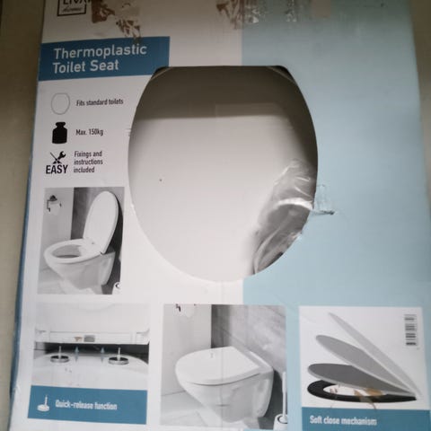 Avaamattomassa paketissaan oleva wc-istuimen kansi. Musta. Kuvat samanlaisesta käytössä olevasta kannesta.