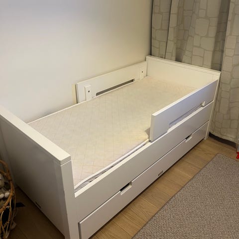 Hyväkuntoinen 150x85cm lastensänky käytännössä käyttämättömillä patjoilla ja yökylä jatkeella joka rullaa sängyn alta esiin.