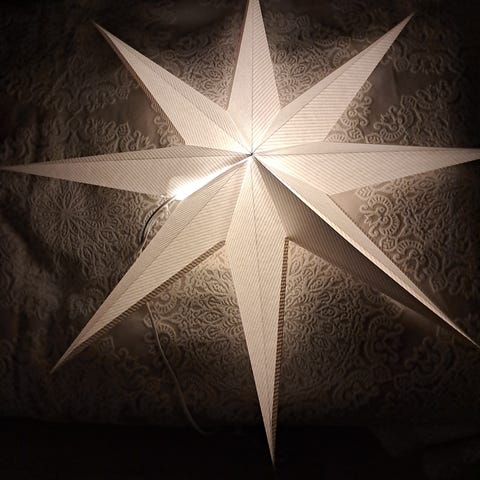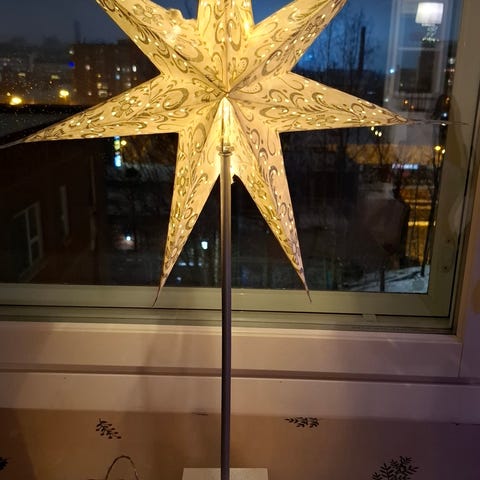 Suuri ulos tai sisälle seinälle laitettava ruskeaa punosta oleva tähtivalo.Ei ole käytetty kun vain kuvassa oli päällä.Halkaisija n.80 cm.Tähti ei ole litteä vaan " kohollaan".Takaa litteä,mikä tulee seinää vasten.