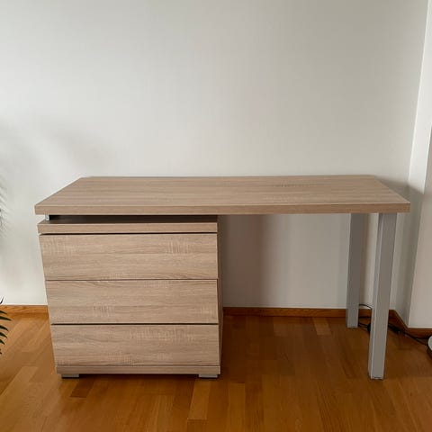Pöydän pinnassa on pieniä käytön jälkiä. Laatikostojen kahvoissa on hieman kulumaa, mutta ne toimivat moitteettomasti. Yleisilmeeltään pöytä on siisti ja käyttökelpoinen.Kuvattu rullien päällä, jotka eivät kuulu mukaan.