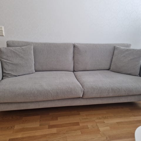 Kangas on hieman kulunut istuinosassa ja siinä on havaittavissa muutamia käytön jälkiä. Jalat ovat tukevat, mutta niissä on pieniä naarmuja. Yleisilmeeltään sohva on kuitenkin siisti ja käyttökelpoinen.