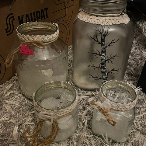 Uusi Maria Droshila kynttilälahjapakkaus, sis. hopeanvärinen kynttilä, tulitikkuaski ja lasinen alulautanen. Kynttilän korkeus n. 11 cm, lasilautasen hakjaisija 12 cm.