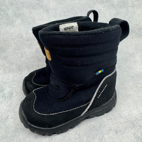 Yhdellä käytössä olleet Kavat Voxna -vedenpitävät talvikengät koko 23. Kuoman tyyliset, mutta meillä tykätymmät. Joitain käytön jälkiä, ei vaikuta ominaisuuksiin. Kantapään kohta ei ole ohentunut.